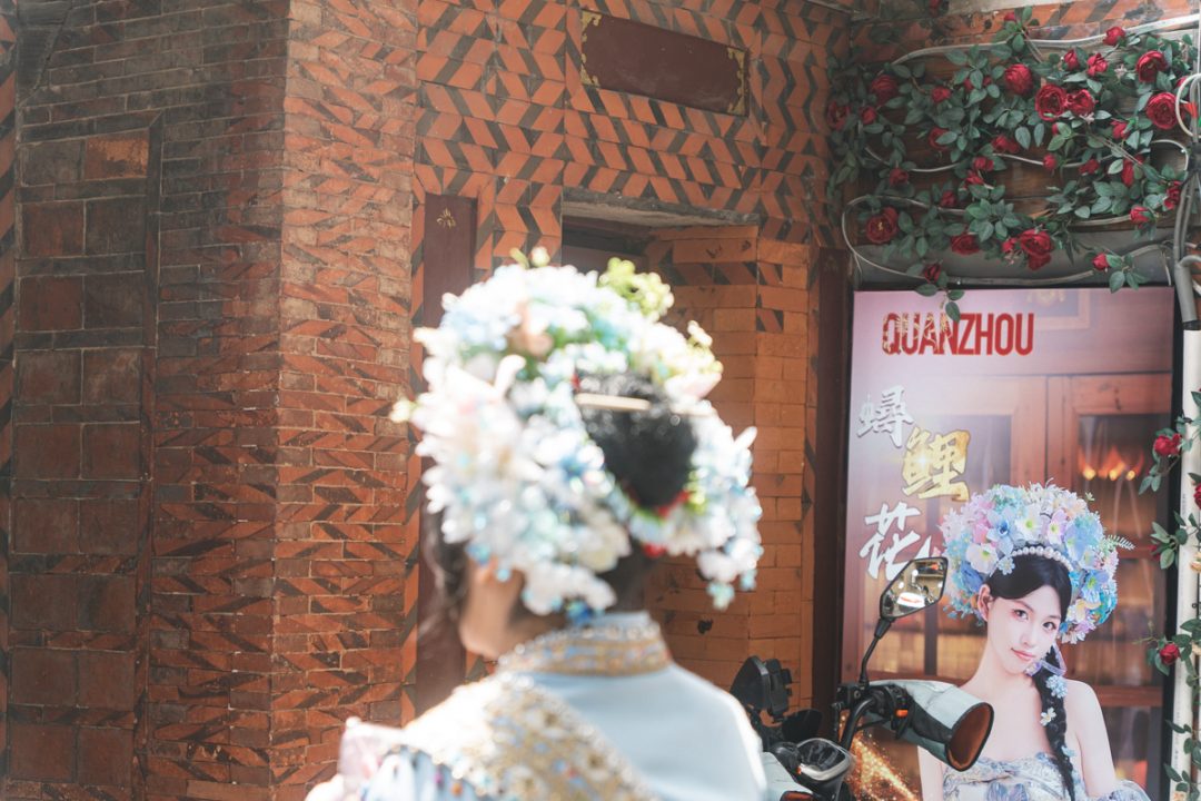 一際目を引くのが、あちこちにある「簪花囲」と呼ばれる泉州伝統の花簪を体験させてくれるお店。