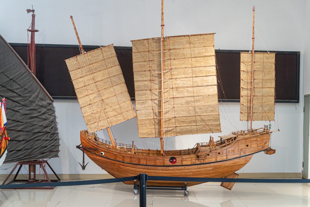 館内には帆船の模型やシルクロードを通じて運ばれた品々が並び、レプリカとともに貴重な実物も展示。