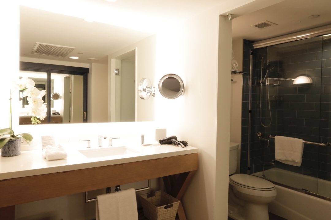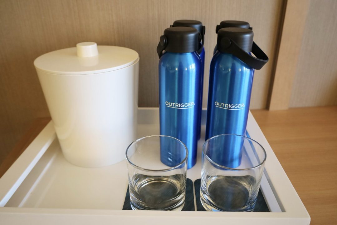 アメニティとしてホテルのロゴが入ったウォーターボトルがもらえるので、フロントデスク横にあるウォーターサーバーでお水を補充して持ち歩くことも可能。