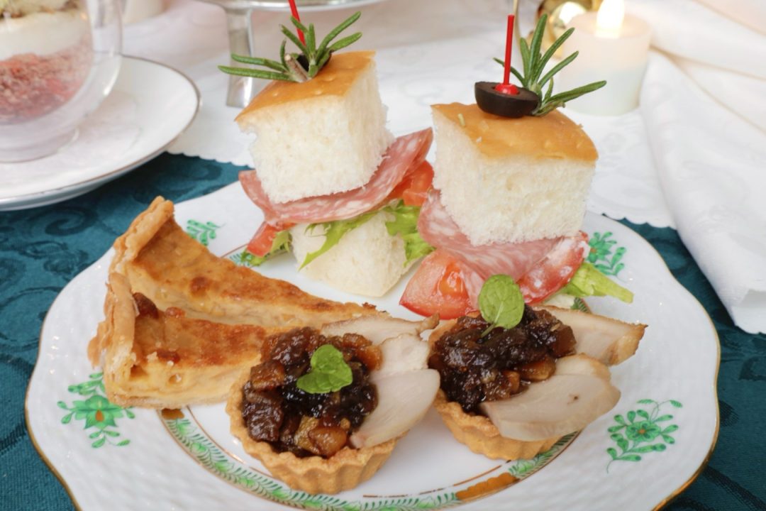 冷菜とは別に温かいセイボリーが提供されます。 メニューはミンスミートと紅茶鴨のタルト、オニオングラタンクイッシュ、サラミとトマトのフォカッチャサンドの3種。
