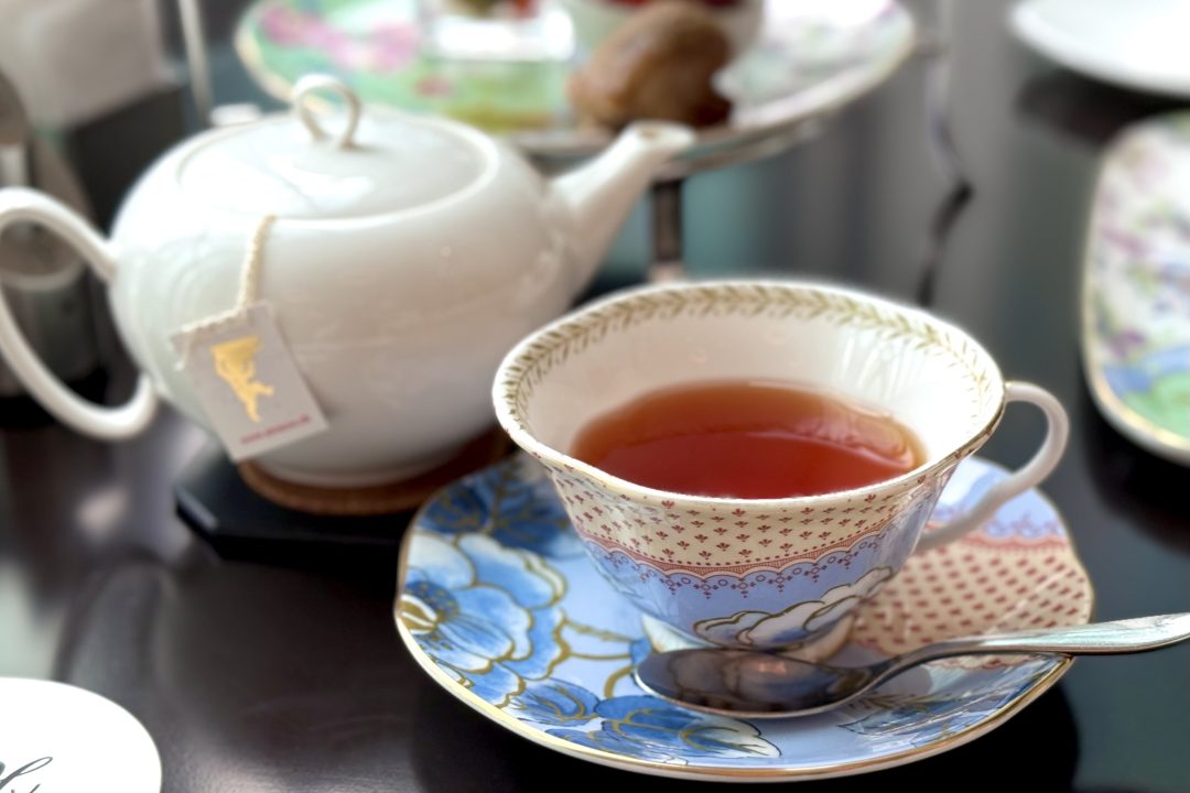 ウエッジウッドの華やかな「バタフライブルーム」シリーズの茶器で楽しめるのも、魅力のひとつ。