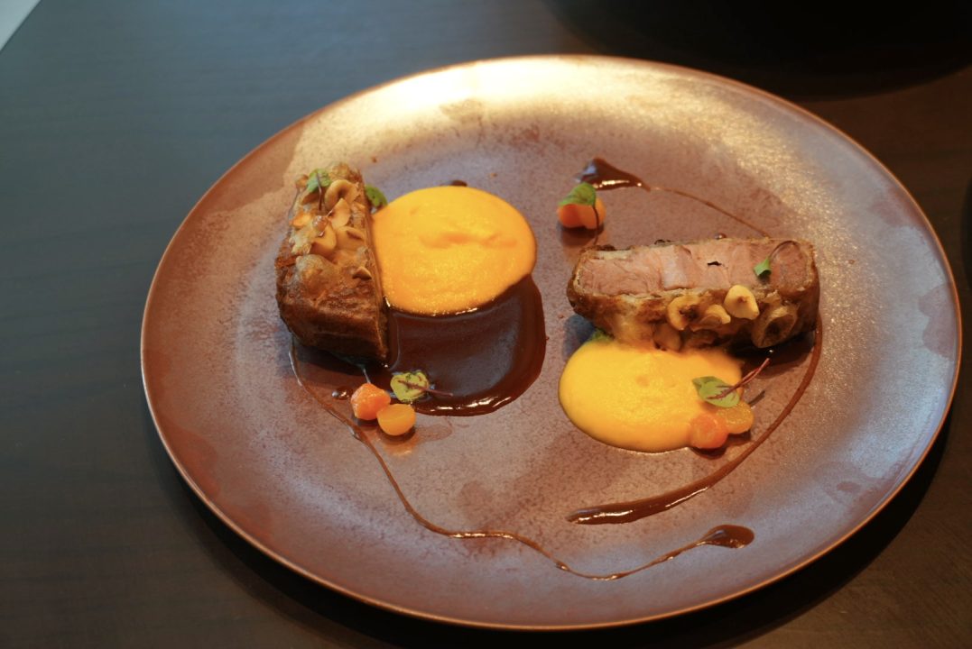 外側は香ばしく、中はしっとりとした食感が特徴です。ラムのコクを活かしながらも重たさを感じさせない仕上がりで、ミモザカラーを思わせる人参のエスプーマが全体にやわらかさと甘みを添えています。