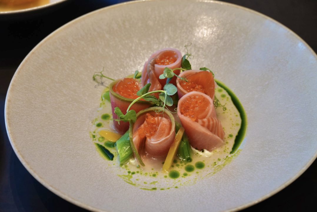 タスマニア産サーモンのグラブラックス サーモンコンソメ 春野菜
