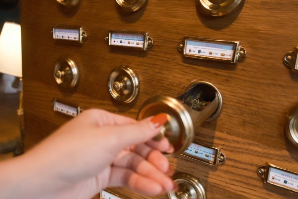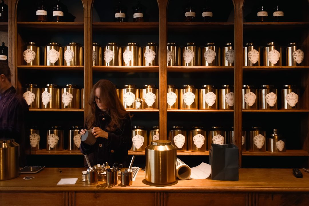 目の前に広がる薬草や香水の瓶びっしりと積まれた薬剤棚や重厚感ある店内。