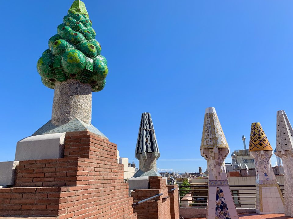 カラフルなキノコのような形をした煙突はまるでオブジェのようで、ガウディが邸宅に抱いている概念を表現しています。