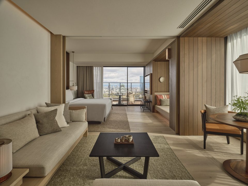 全252室の客室は高層階に配置され、大阪の街並みを一望できる眺望と、落ち着いた色調でまとめられたインテリアが特徴です。
